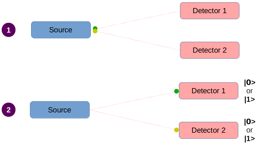 (1) At the left we have a source of qubits (or quantum particles) emitted by a single source in two separate direction. At the right we have two detectors facing the trajectory of qubits.